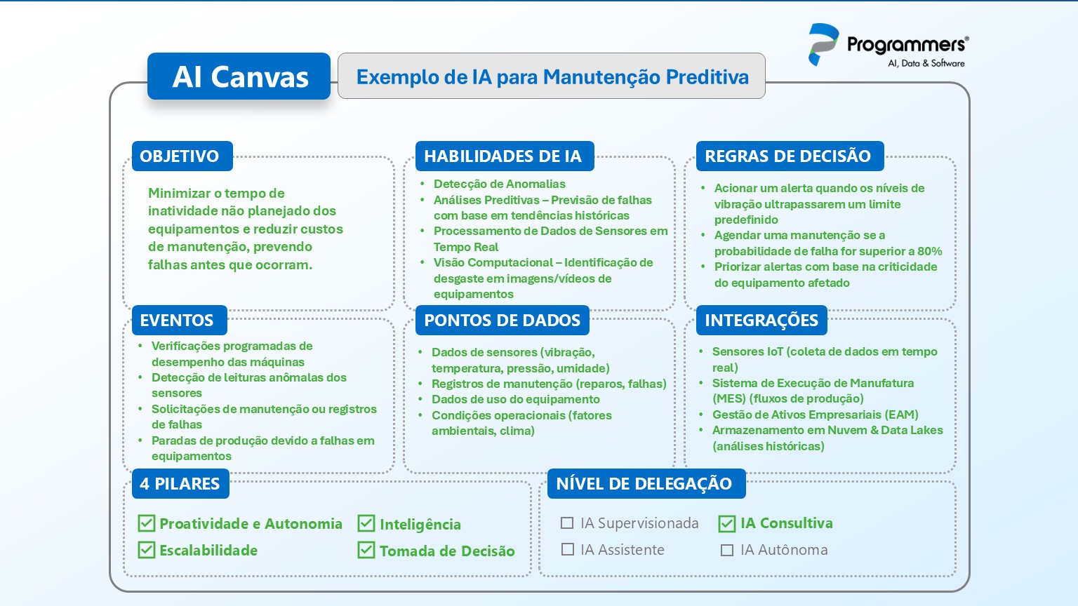 Por fim, para ajudar você a entender como preencher o AI Canvas, aqui está um exemplo real de uma solução de IA para Manutenção Preditiva.